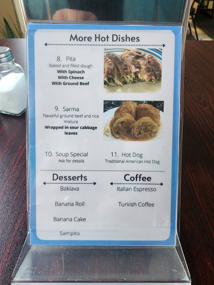 As a reviewer looking back over the menu at Mb Coffee And Grill, I’m left with the impression of a thoughtfully curated selection that balances hearty Balkan-inspired comfort food with simple, satisfying café staples. The grilled section clearly anchors the experience, with bold flavors and generous portions showcased through Cevapi, Sis Cevapi, Pljeskavica, Link Sausages, and the crowd-pleasing Mixed Meat Combo, which feels ideal for guests who want to sample a bit of everything off the grill. Beyond the grill, the kitchen continues to deliver warmth and tradition with its hot dishes, including Pita, Sarma, and a rotating Soup Special, alongside familiar favorites like the Hot Dog, offering something approachable for every type of diner. The dessert menu provides a sweet and comforting finale, featuring classic options such as Baklava, Banana Roll, Banana Cake, and Sampita, each adding a homemade touch that rounds out the meal nicely. To complete the experience, the coffee offerings-Italian Espresso and Turkish Coffee-bring an authentic and aromatic finish, whether you’re stopping by for a full meal or just a relaxed coffee break. Overall, the menu comes together as a cohesive reflection of Mb Coffee And Grill’s identity: simple, flavorful, and rooted in tradition, making it a satisfying choice for both first-time visitors and returning guests looking for consistent, comforting food.